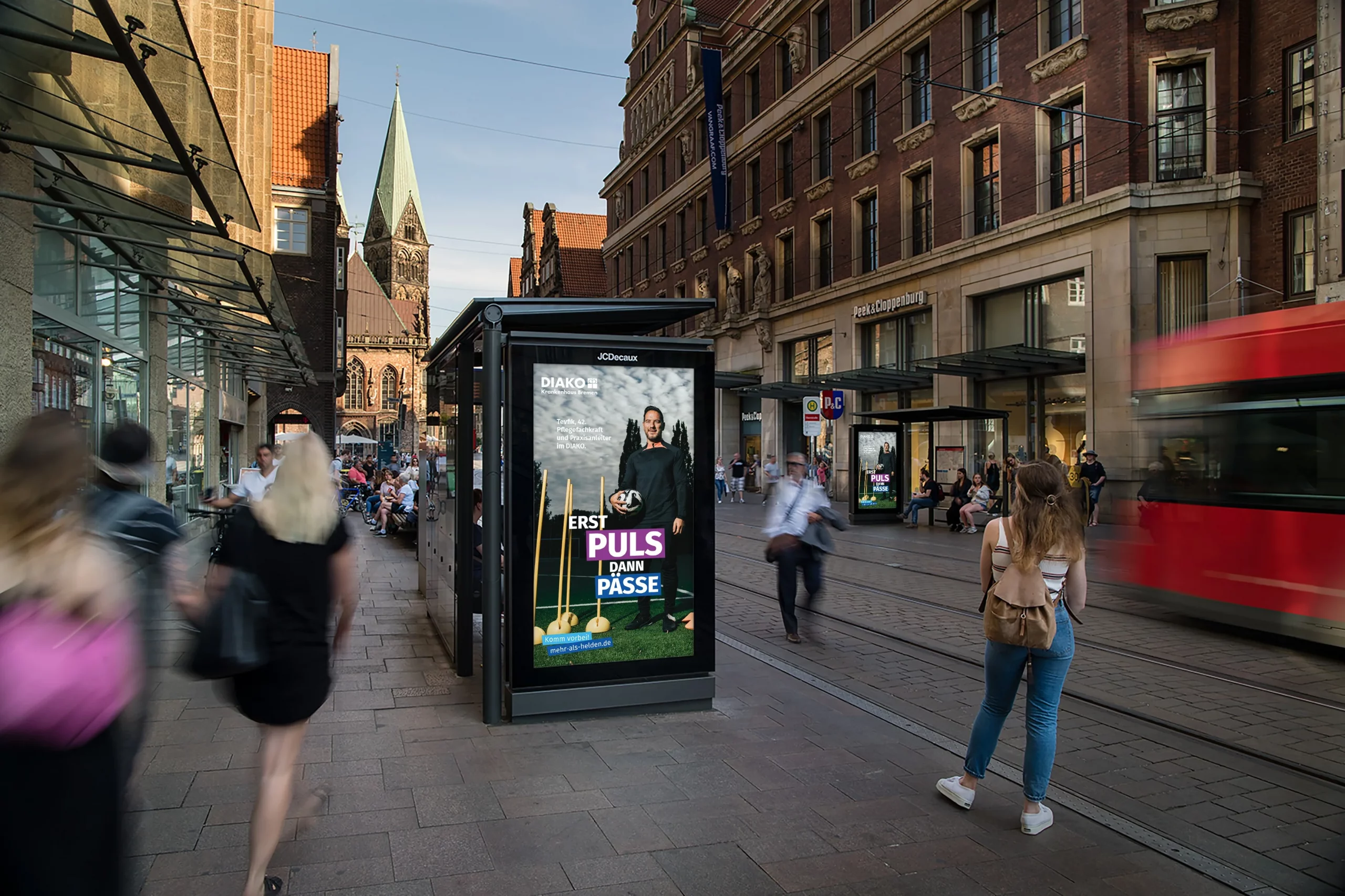 Eine Straßenbahn im DIAKO-Design, City-Screens und Plakate an Hotspots in ganz Bremen: die perfekte Kombination aus analoger Präsenz und digitaler Reichweite.